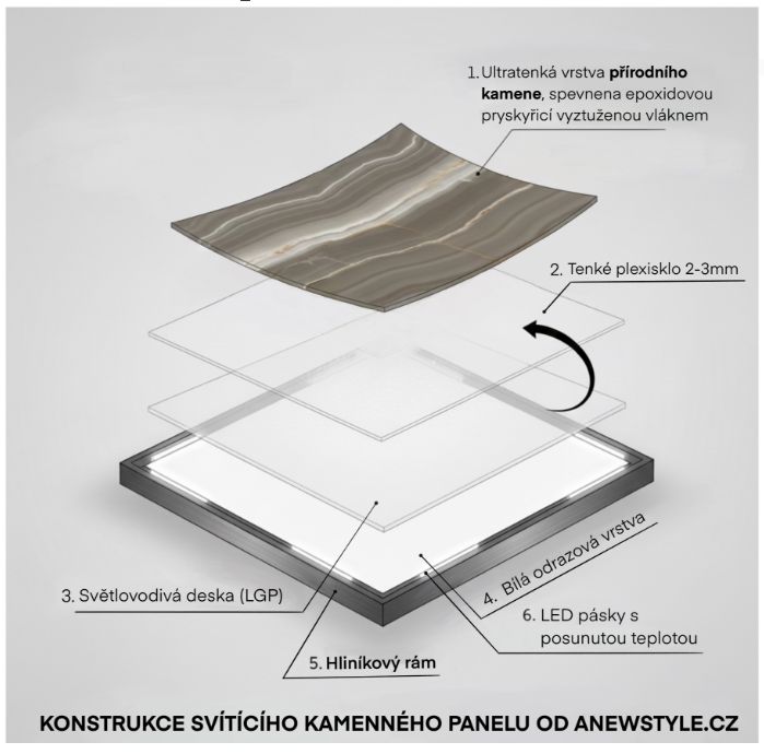 To, co dělá panely AnewStyle.cz tak výjimečnými, je způsob, jakým je kámen prosvětlen. Za dokonale rovnoměrným zářením stojí kombinace tří pokročilých technologií, z nichž klíčová je ta druhá – boční nasvícení (Edge-Lit). Jedná se o postup inspirovaný moderními displeji.